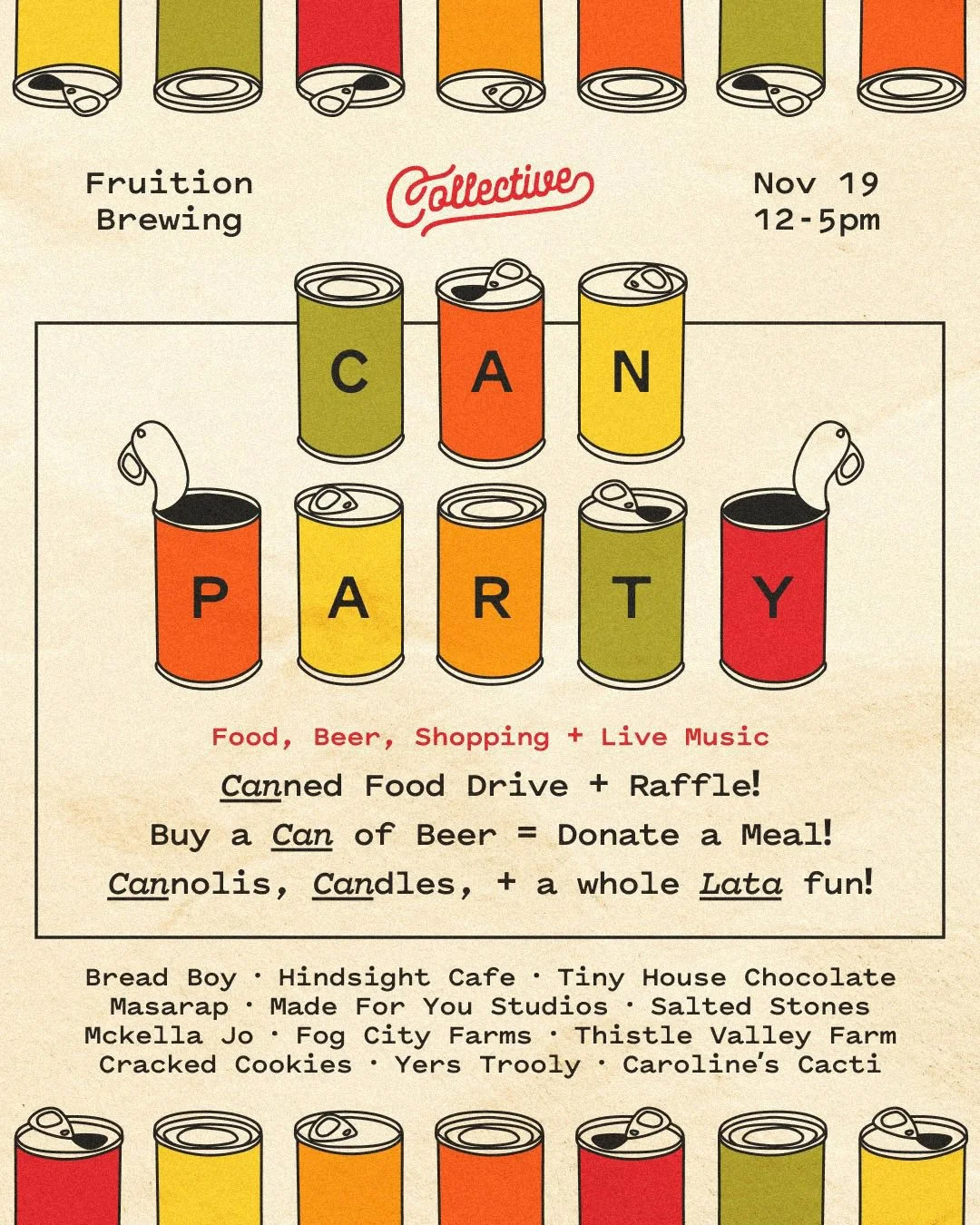 Join the Collective and Fruition Brewing for an afternoon of food, beer, shopping and live music. For every can of beer purchased, a meal will be donated. For every can of food donated, you will recieve an entry into the raffel. Its going to be an afternoon of fun and giving back. We hope to see you Saturday the 19th! Cheers!